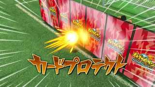 カードを並べた盾でゴールを守る超次元サッカーカードバトルキーパー技!